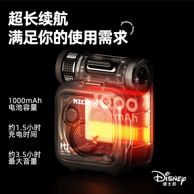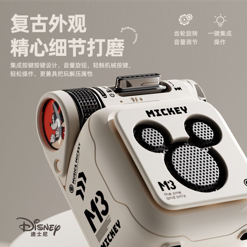 迪士尼正版授权,复古朋克蓝牙音箱。精美潮酷复古外观蓝牙5.4,稳定播放不卡顿,3W内磁喇叭,峰值可达5w,HiFi音质支持TF卡,蓝牙多种模式连接使用,支持tws对联,秒变双单元低音炮超大电池容量,超长续航,满足日常畅听需求