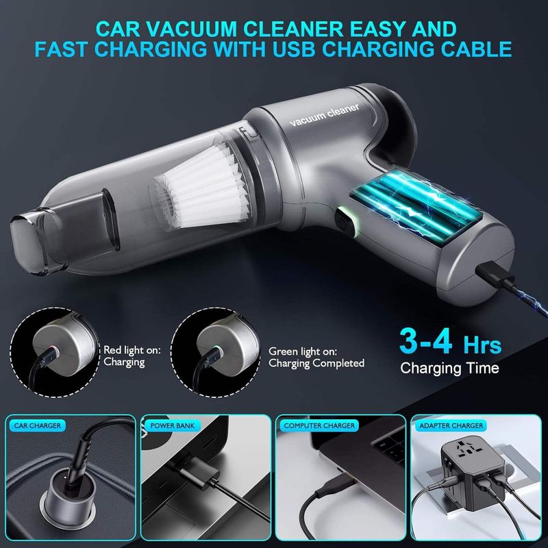 1. Main Unit: Handheld design, comfortable grip, flexible operation, easily reaching every corner inside the vehicle. Strong suction quickly removes dust and debris for efficient cleaning.